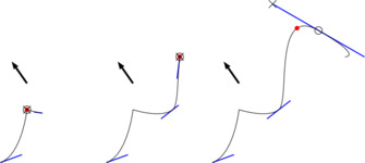 However, when creating a path from a sub-range of another path, the basic operation of connecting two sliders will create a path without interpolation points on the outsides. To specify interpolation points on the outside of the new path, one may attach interpolation points to the sliders before connecting them. (By using this technique with the end point sliders of a path, one can thus attach or replace interpolation points on the outside end of a complete path.)